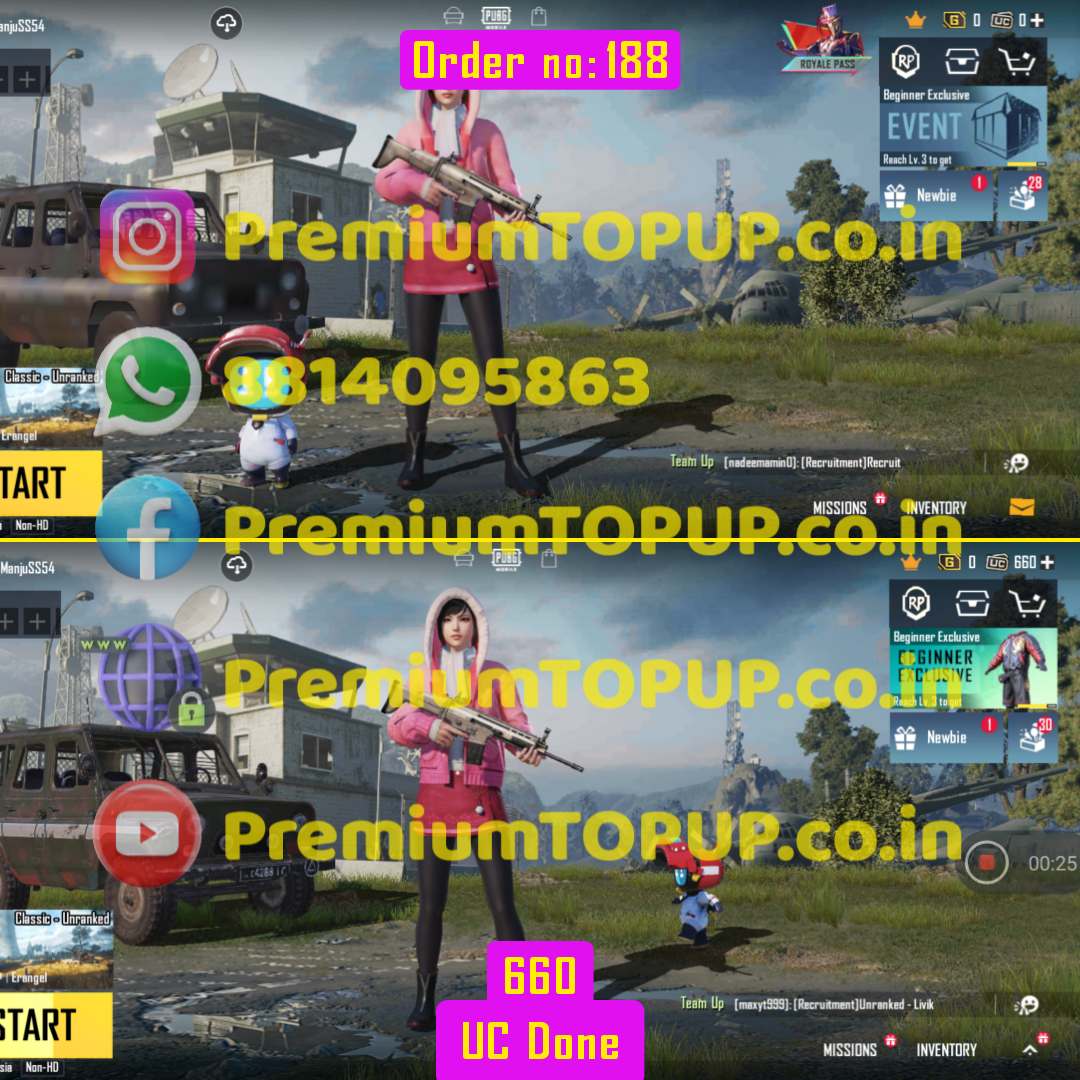 PUBG Mobile 660 UC in-app Topup. 100+ Topup completed. CHECK PROOFS